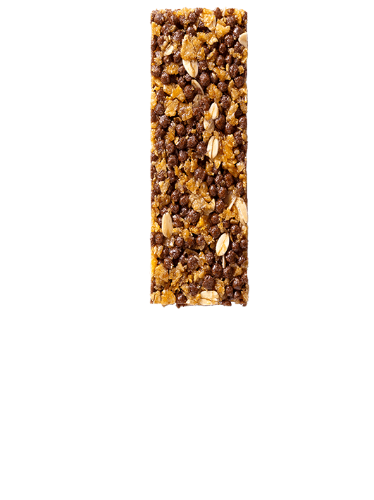 Glukoosisiirappi, viljamurot (vehnäjauho, sokeri, maissijauho, riisijauho, ohramallasuute, suola, karamelisoitu sokerisiirappi), maitosuklaa 20% (sokeri, kaakaomassa*, kaakaovoi*, rasvaton maitojauhe, maitorasva, emulgointiaine (E442, E476), täysjyväviljalastut 9% (kaura, vehnä), kookosrasva, karamellijauhe 5% (makea herajauhe (maidosta), maltodekstiiri, palmurasva, sokeri, karamellisoitu sokerisiirappi), maissihiutaleet (maissi, suola, ohramallasuute), glukoosi-fruktoosisiirappi, stabilointiaine (glyseroli), merisuola, luontaiset aromit, emulgointiaine (lesitiinit). Saattaa sisältää pieniä jäämiä pähkinöitä ja maapähkinää.