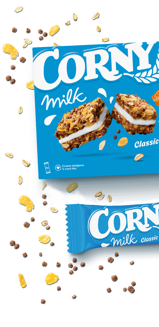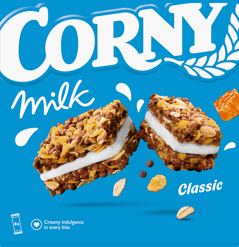 Corny Milk Classic on se vieläkin herkumpi välipalapatukka, jossa on hunajalla maustettua maitokreemitäytettä, kahden myslikeksin välissä. Käytännöllinen monipakkaus.