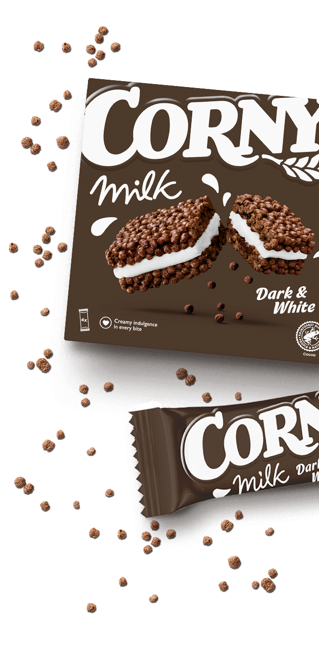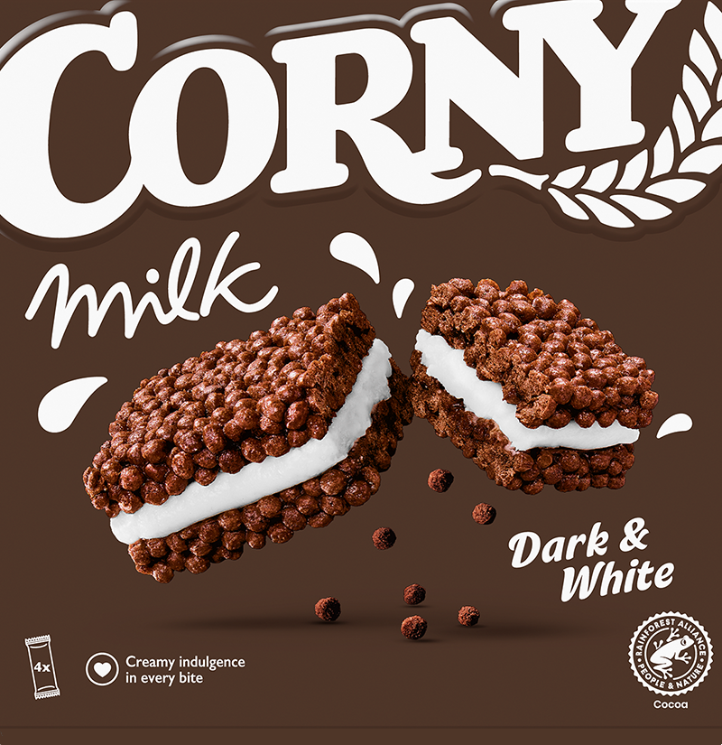 Corny Milk Dark & White se vieläkin herkumpi välipalapatukka, jossa on rapeita suklaamyslipaloja ja kermaista täytettä. Täydellinen eväs tai välipala, kun tarvitset lisäenergiaa. Käytännöllinen monipakkaus.